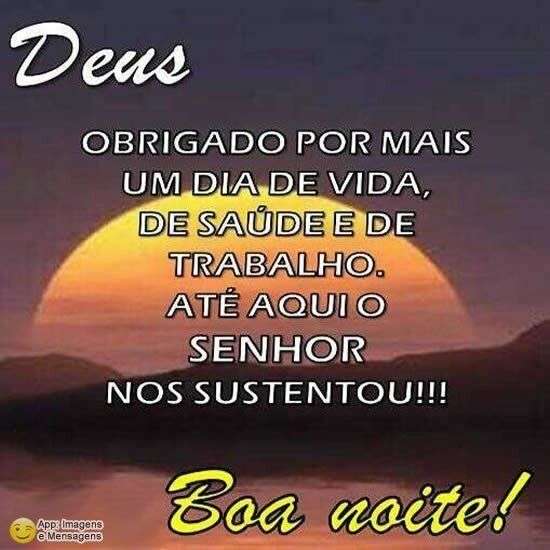 Deus obrigado por mais um dia de vida, de saúde e de trabalho, até aqui o Senhor me sustentou!!! Boa noite!