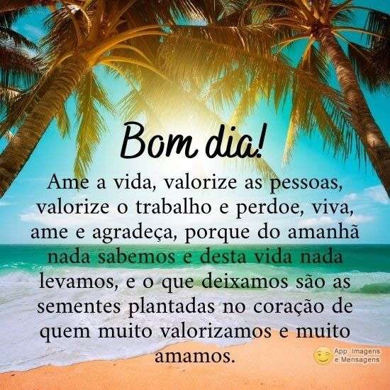 Ame a vida, valorize as pessoas, valorize o trabalho e perdoe, viva, ame e agradeça, porque do amanhã nada sabemos e desta vida nada levamos, e o que deixamos são as sementes plantadas no coração de quem muito valorizamos e muito amamos.