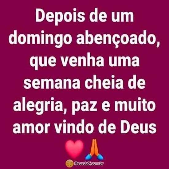 Depois de um domingo abençoado, que venha uma semana cheia de alegria, paz e muito amor vindo de Deus.