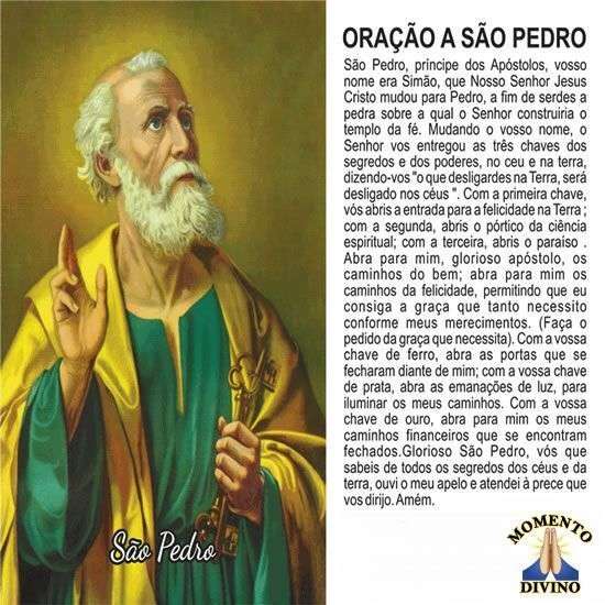 Com a vossa chave de ouro, abra para mim os meus caminhos financeiros que se encontram fechados. Glorioso São Pedro, vós que sabeis de todos os segredos dos céus e da terra, ouvi o meu apelo e atendei à prece que vos dirijo.