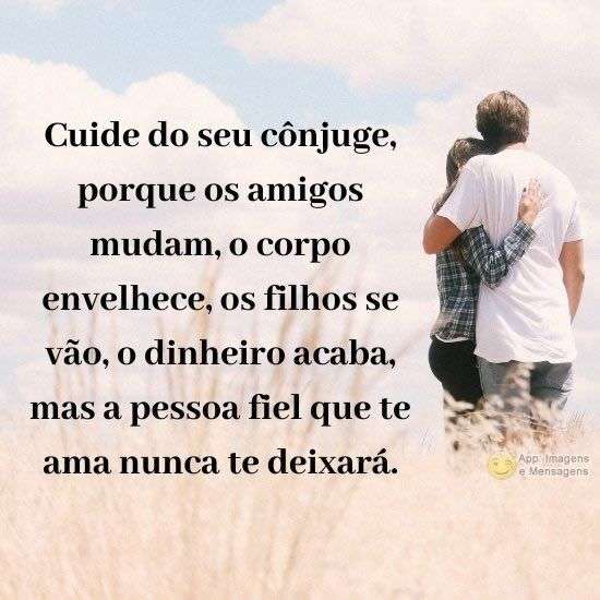 Cuide do seu cônjuge, porque os amigos mudam, o corpo envelhece, os filhos se vão, o dinheiro acaba, mas a pessoa fiel que te ama nunca te deixará.