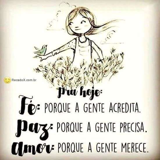 Pra hoje: Fé: Porque a gente acredita. Paz: Porque a gente precisa. Amor: Porque a gente merece.